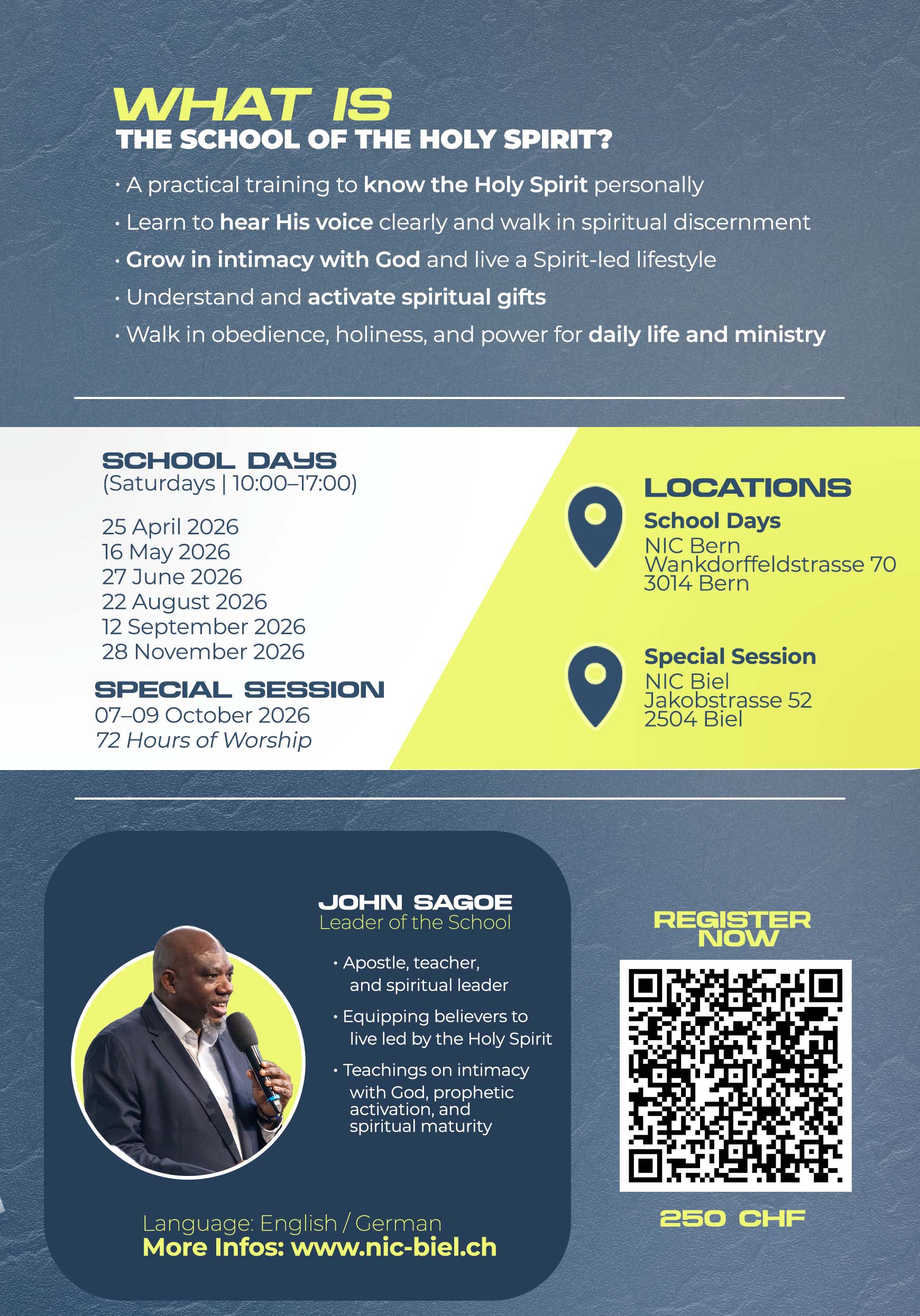 Throughout the School of the Holy Spirit, participants are guided to hear the voice of the Holy Spirit more clearly, develop spiritual discernment, and live a life led by the Spirit – in everyday life, ministry, and personal decision-making.